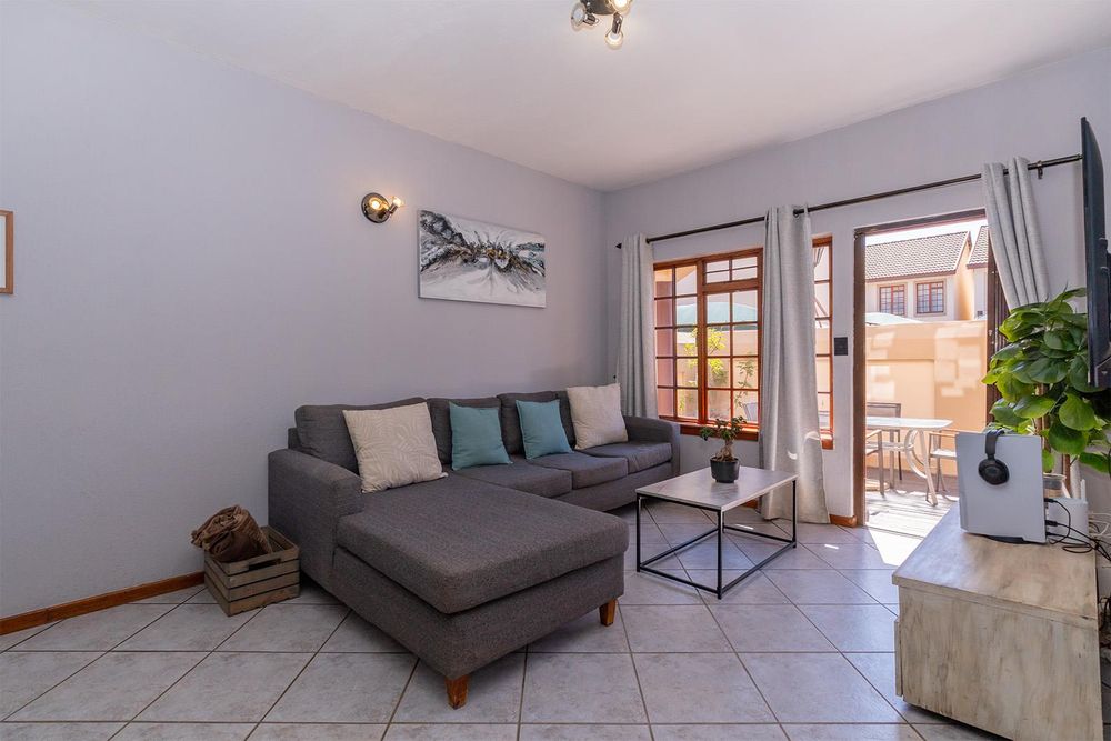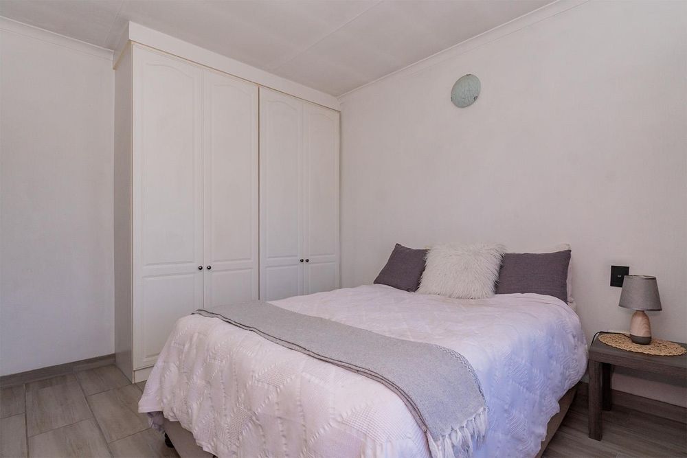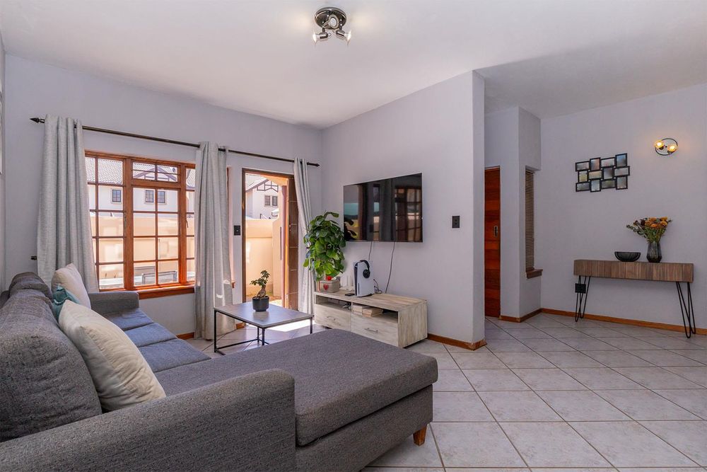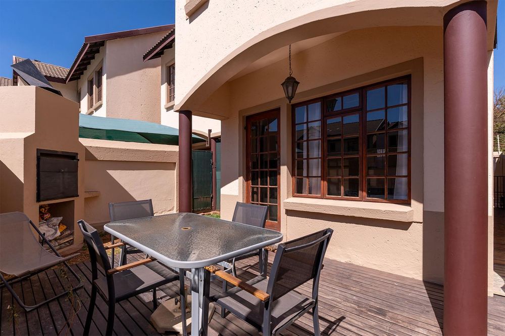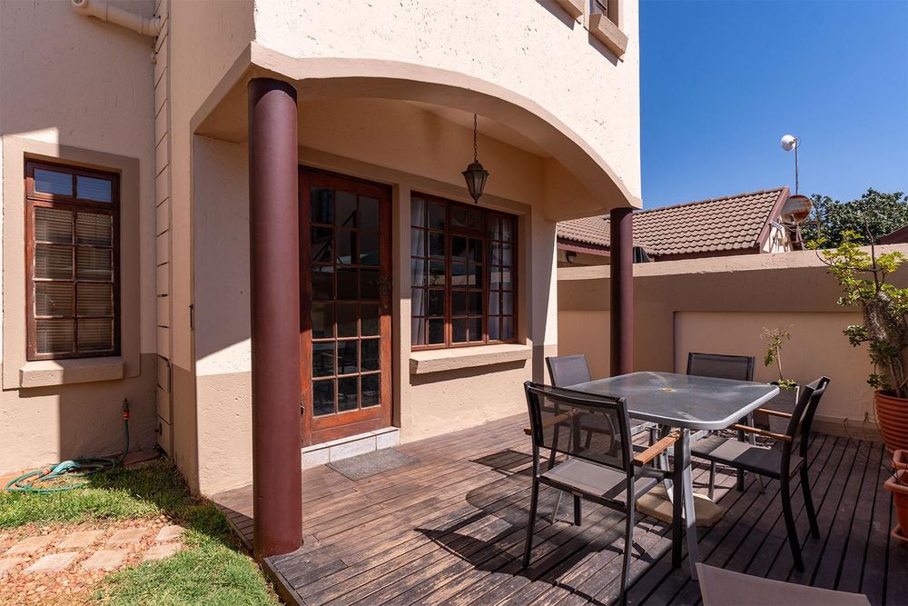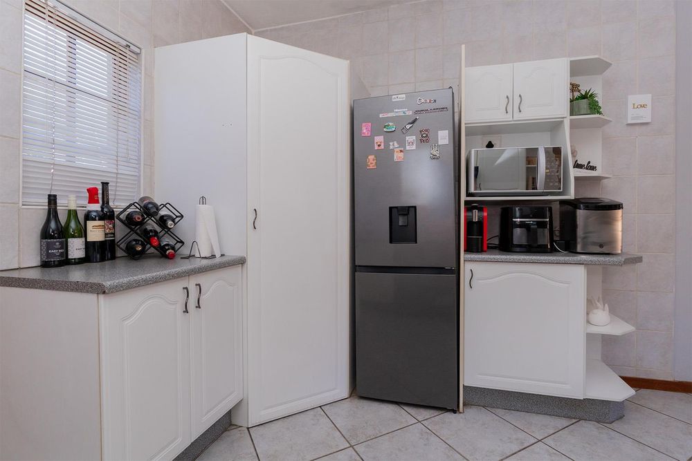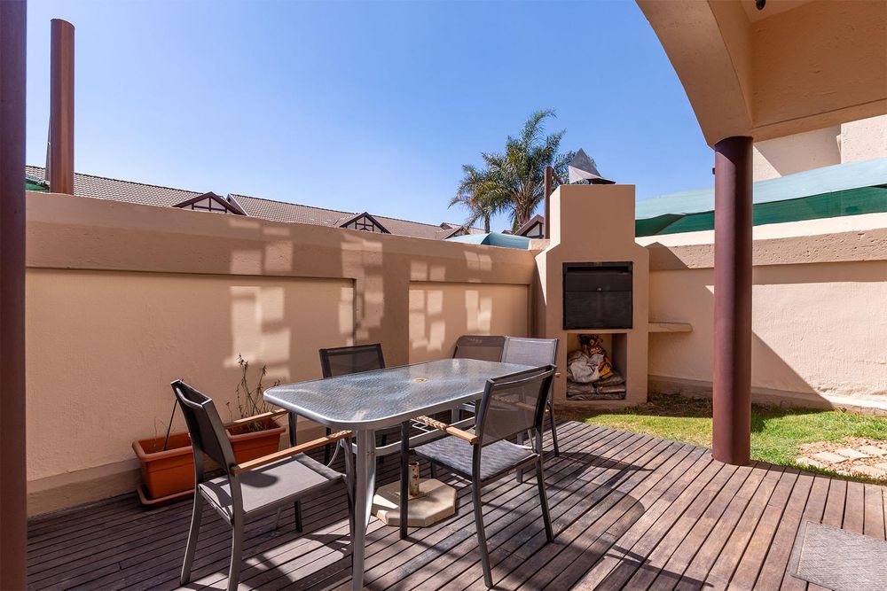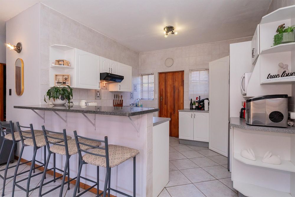 Spacious open plan tiled lounge with door leading to wooden deck (recently replaced) patio with built in braai, open plan tiled kitchen with granite breakfast counter, gas hob, under counter electric oven, extractor fan, ample space for appliances, built-in cupboards with pantry cupboard, recently renovated tiled guest bathroom with toilet and basin.