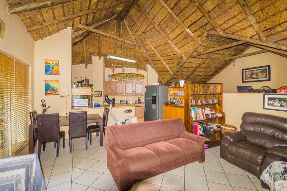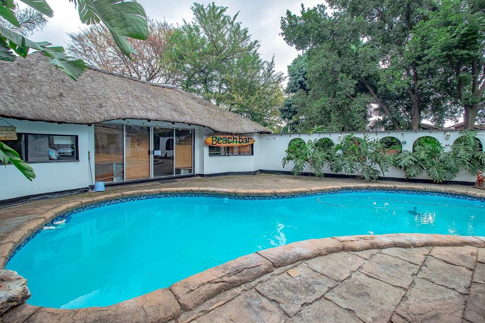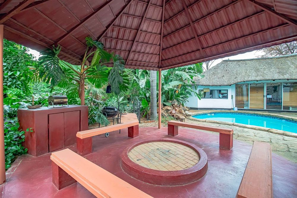 The main residence comsists of four well-sized bedrooms and two bathrooms, along with three exceptionally large living areas, one of which features a built-in fireplace. All living areas flow seamlessly onto covered patios, overlooking a beautifully landscaped garden and a recently renovated swimming pool. and a covered braai area. Adding to the appeal is a charming thatched lapa, complete with two bedrooms, a lounge, dining area, kitchen, and bathroom—ideal for extended family, or over night guests. (There are steps in the lapa so not recommended for persons with walking disabilities)