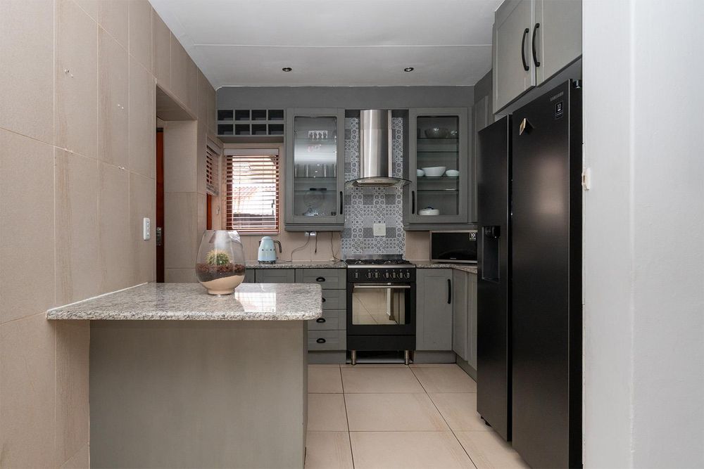 The modern kitchen is fitted with granite countertops, ample cupboard space, a gas stove, and a separate scullery area for added convenience.