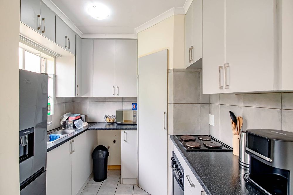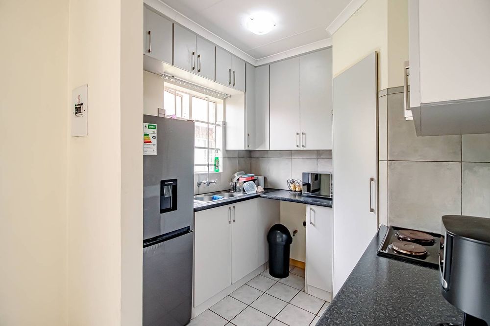 With a neat kitchen offering ample cupboard space.