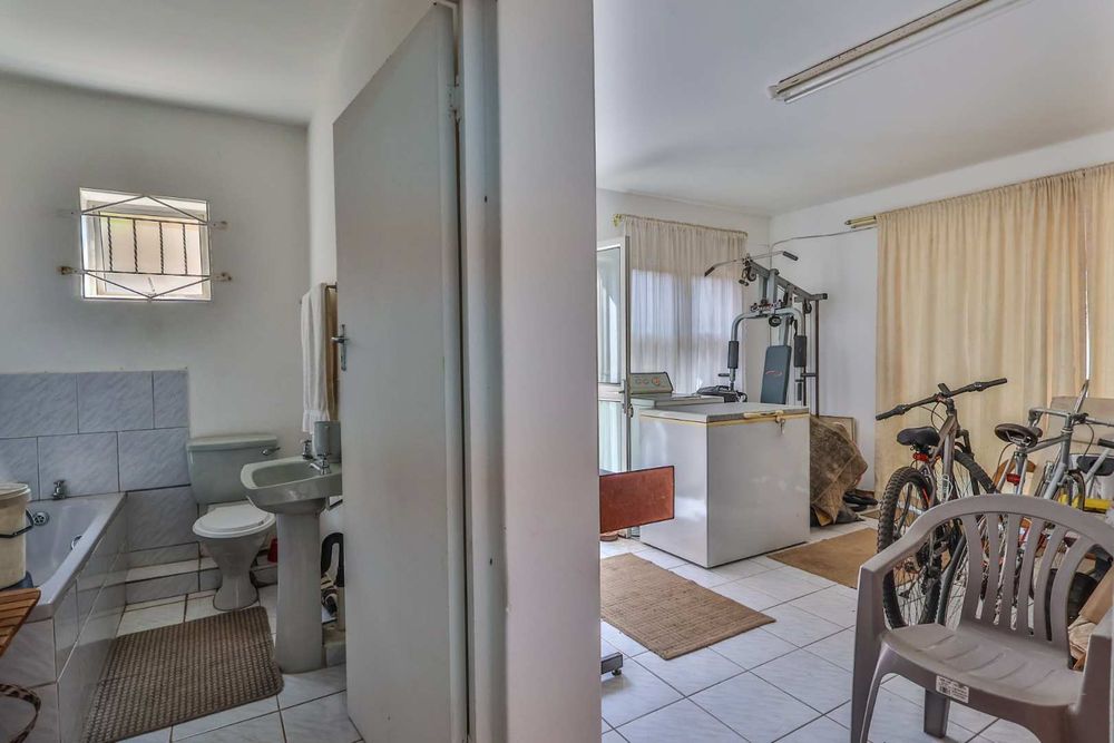 Securely set behind a motorised gate with a double garage, the home offers 4 bedrooms, 2 bathrooms and porcelain tiles throughout. Open-plan lounge and dining areas flow effortlessly into a large kitchen with a cosy eating space — practical, warm, and well thought out.