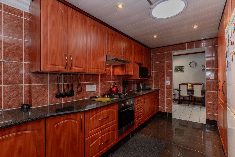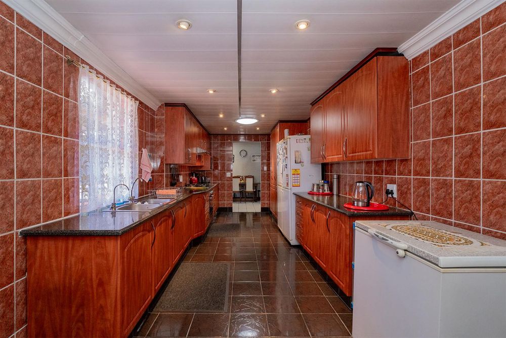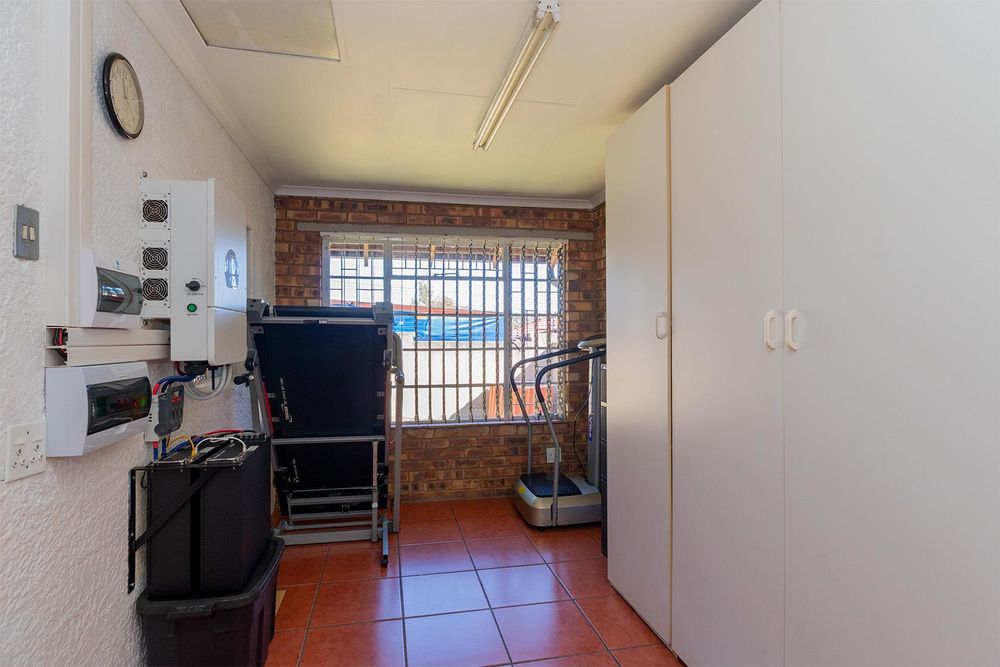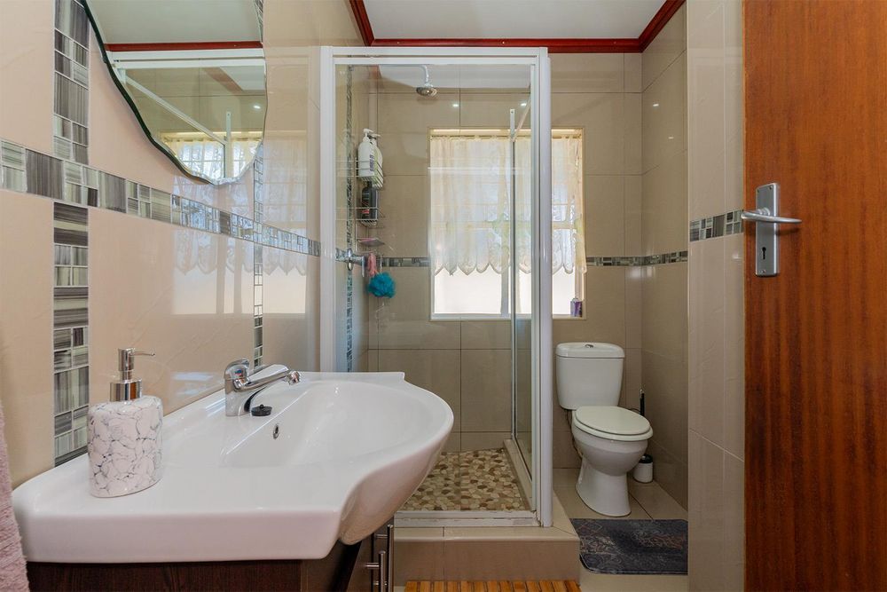 At the heart of the home, the modern kitchen boasts granite countertops, ample cupboard space, and a gas hob – perfect during loadshedding. A separate laundry room adds extra convenience.