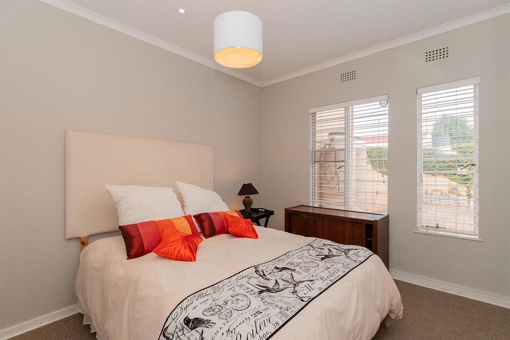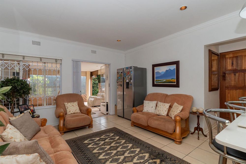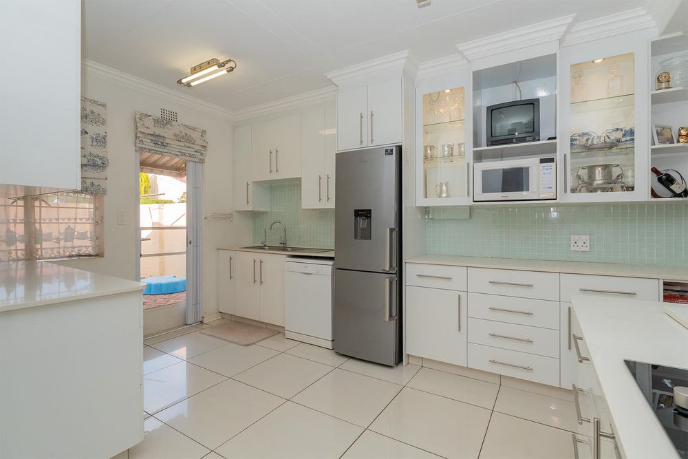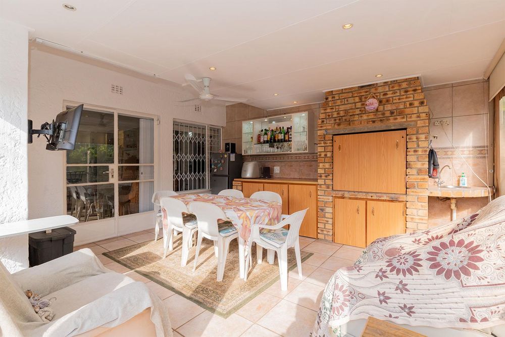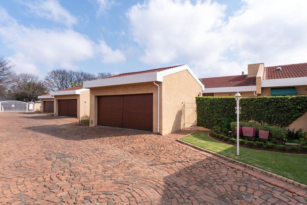 Quaint carpeted formal lounge (possible study) with small bar area and wine rack, spacious tiled dining area/lounge with french doors leading to an impressive tiled entertainment area with built in braai, fitted cupboards, prep bowl, ceiling fan, enclosed with canvas awnings and overlooks an exquisite very private garden, gourmet open plan tiled kitchen with Ceasar stone tops, breakfast counter with gas hob, prep bowl and under counter electric oven, combined scullery with ample cupboards and door leading to private courtyard, tiled TV room with ceiling fan, 3 good sized carpeted bedrooms with main bedroom having a french door opening to garden, 2 bathrooms with one being en-suite to main bedroom, double automated garage with direct entry and laundry facility.