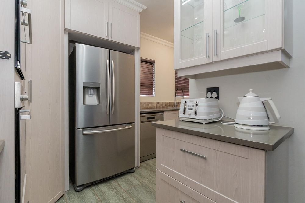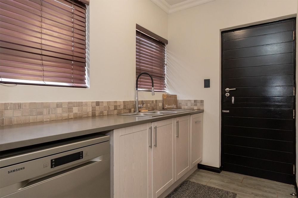 The gourmet kitchen is both stylish and functional, with Caesarstone countertops, ample built-in cupboards, a gas hob, fitted microwave, and a separate scullery. The guest toilet adds convenience on the lower level.