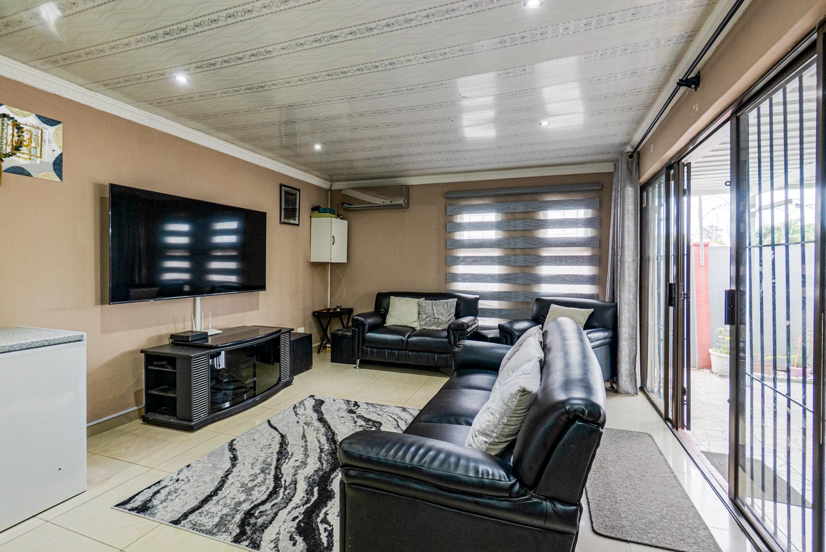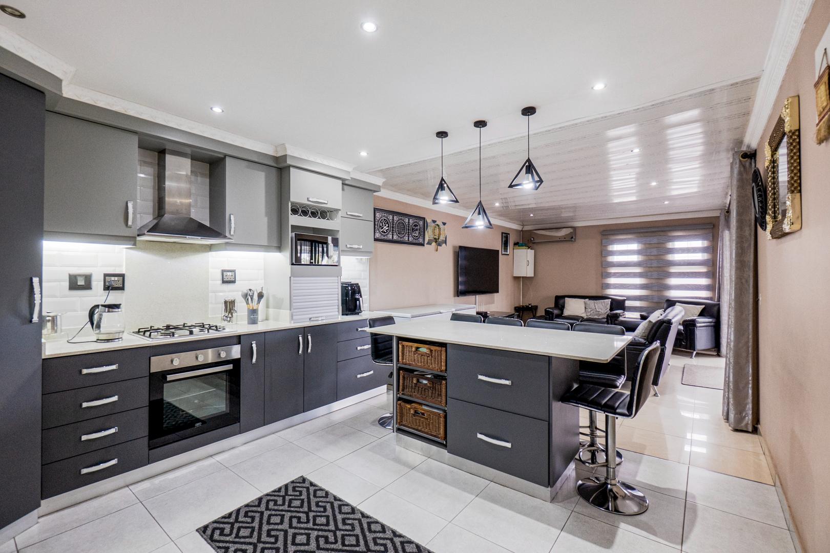 Open plan kitchen, lounge and dining room with an incredible kitchen and island. Leading out from the fully tiled home is the outdoor entertainment area with built in serving space. Perfect for being outdoor and the perfect braai setting.