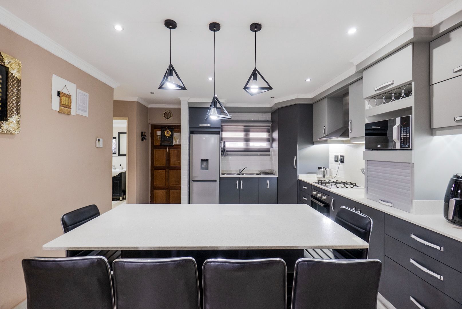 Down the passage are three bedrooms all with built in cupboards. The main bedroom has an en-suite. The unit does have air-conditioners. Bathrooms are also ultra modern. Additional space is the outside laundry area. The lighting and ceilings throughout the unit is amazing.
