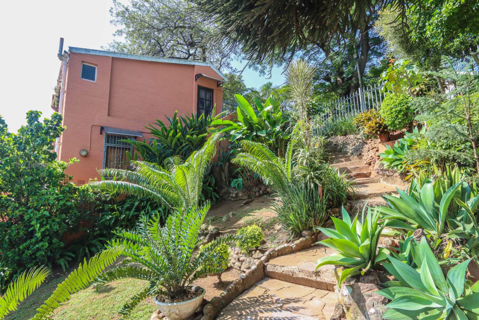 Large sloped yard, securely fenced and ideal for kids or pets