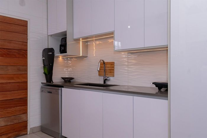 The modern kitchen is both stylish and functional, featuring granite countertops, ample built-in cupboards, and a separate scullery leading to a private courtyard with washing line.