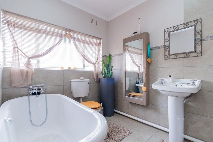 All three bedrooms are well-sized, tiled, and fitted with built-in cupboards. The main bedroom enjoys the added luxury of an en-suite bathroom, complemented by a second bathroom for convenience.