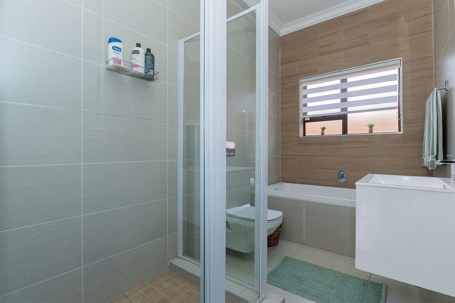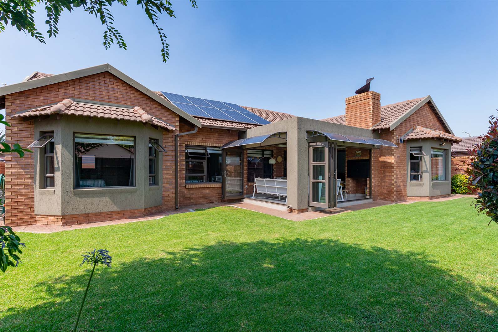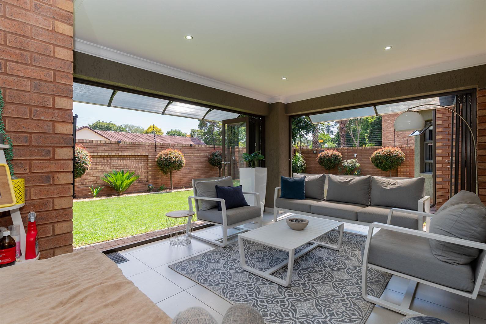 Step inside to discover a home that's both stylish and energy efficient. Equipped with a 5KVA Deye inverter, two batteries, and eight solar panels, this property significantly reduces electricity costs by powering the entire home except for the oven and gas geyser. The kitchen boasts a 5-plate ELBA stove, also powered by gas, ensuring cooking is both efficient and convenient. Outside, a private garden awaits, featuring an irrigation system and a charming covered patio with stacking doors and a built-in braai, perfect for entertaining.
