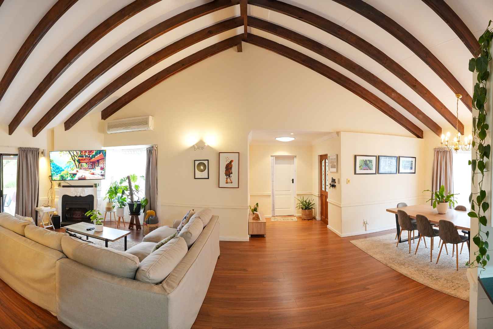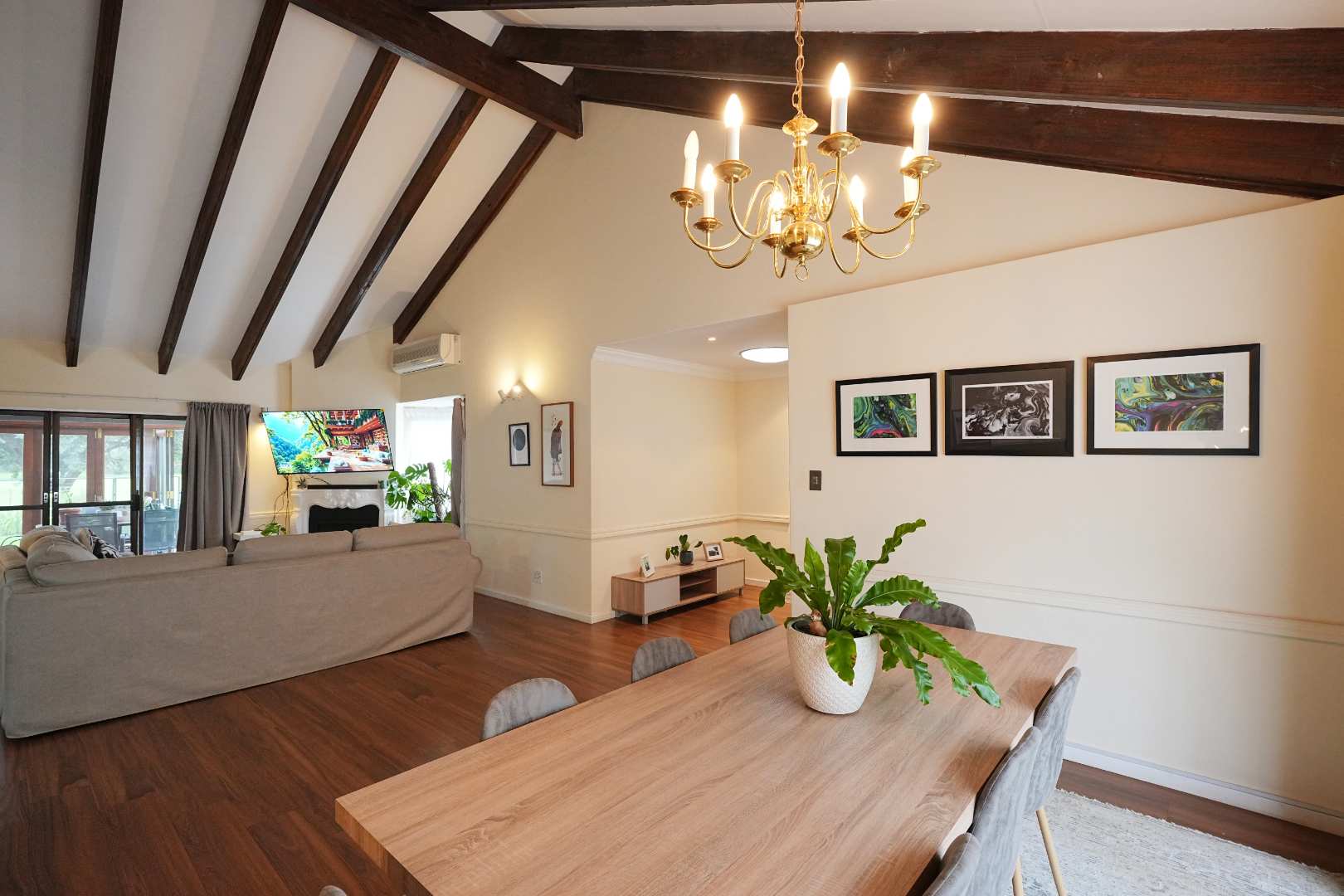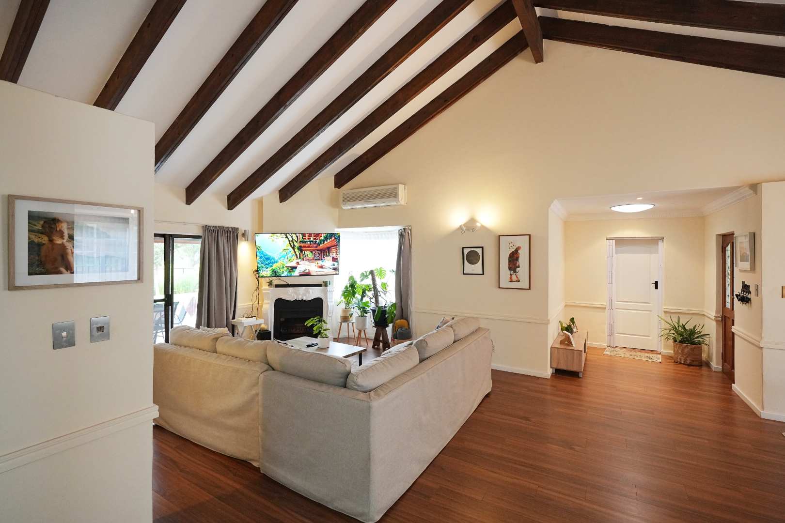 This 3 bed 2 bath (mes) family home offers space with its magnificent indoor / outdoor living. The renovation has left no stone unturned, it's simply immaculate. The 3 garages are a luxury, all on remote control. They lead straight into the home, where you pass the grand main entrance. The lounge is to die for with its double-volume roof and extravagant contrasting wooden beams. The dining room is part of the same opulent space. The kitchen is semi open plan to both areas and has everything you need, including a scullery section, ample counter space, and many cupboards. All bedrooms are generously sized. The 2nd bathroom has only a shower, but the main ensuite has both a bath and a shower. The architectural design is incredible, and breathtaking in parts. The covered patio leads to a courtyard / garden that must be witnessed in person, simply divine. There is a outside gym / bar room depending on your desires. The tranquillity, the views and the position are second to none. Call David to view it.