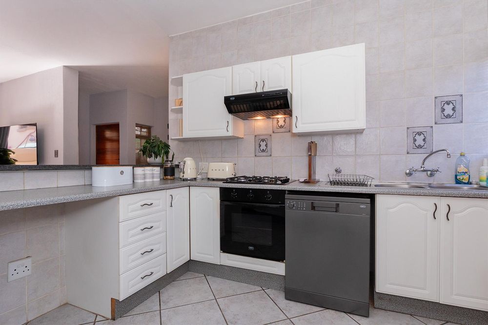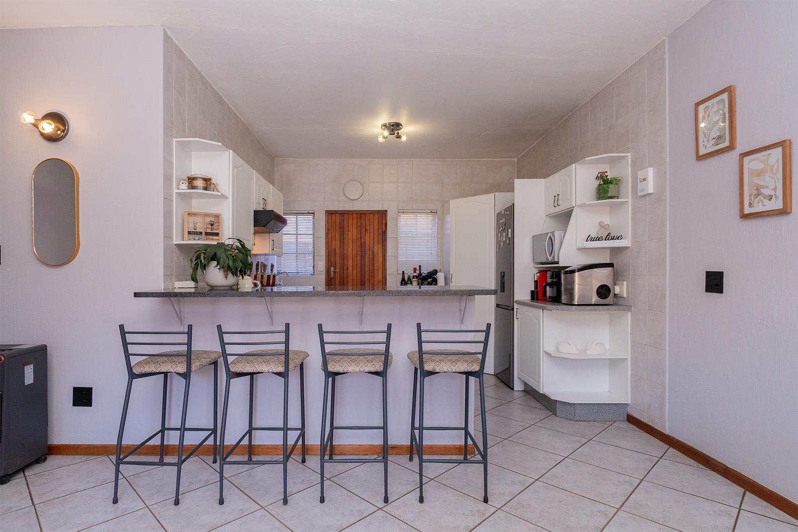 Spacious open plan tiled lounge with door leading to wooden deck (recently replaced) patio with built in braai, open plan tiled kitchen with granite breakfast counter, gas hob, under counter electric oven, extractor fan, ample space for appliances, built-in cupboards with pantry cupboard, recently renovated tiled guest bathroom with toilet and basin.