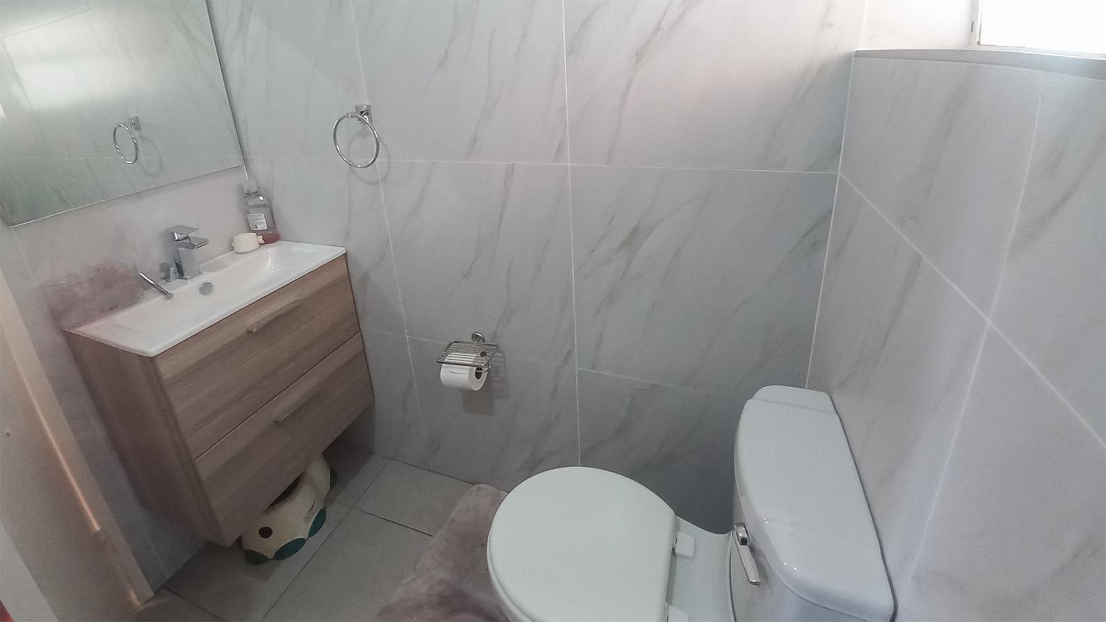 The modern kitchen, fitted with granite countertops, includes a gas hob for added convenience. The home features three spacious bedrooms, with the main bedroom leading directly to the pool area, creating a peaceful retreat. There are two bathrooms, including a modern en-suite with a shower.