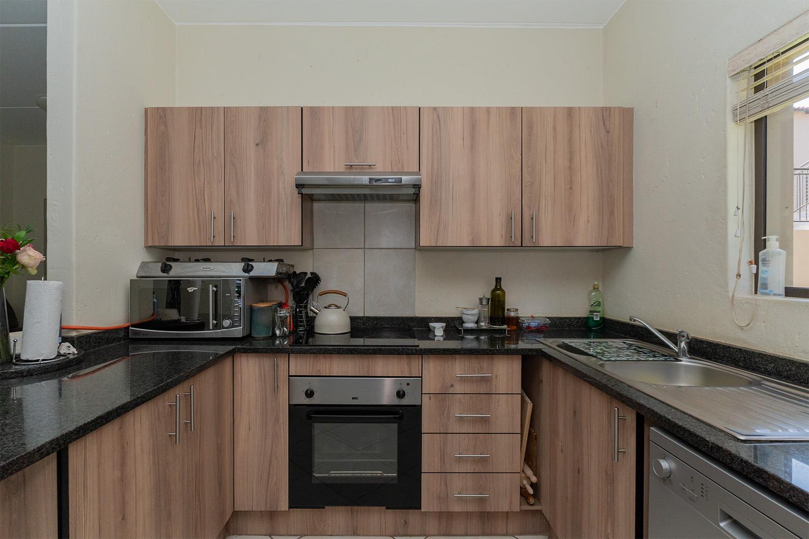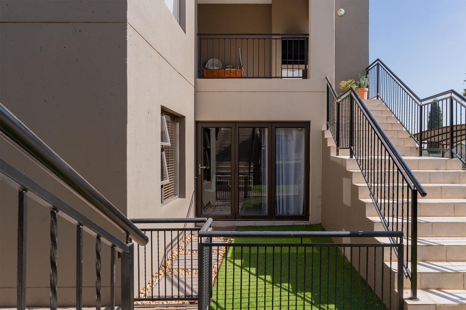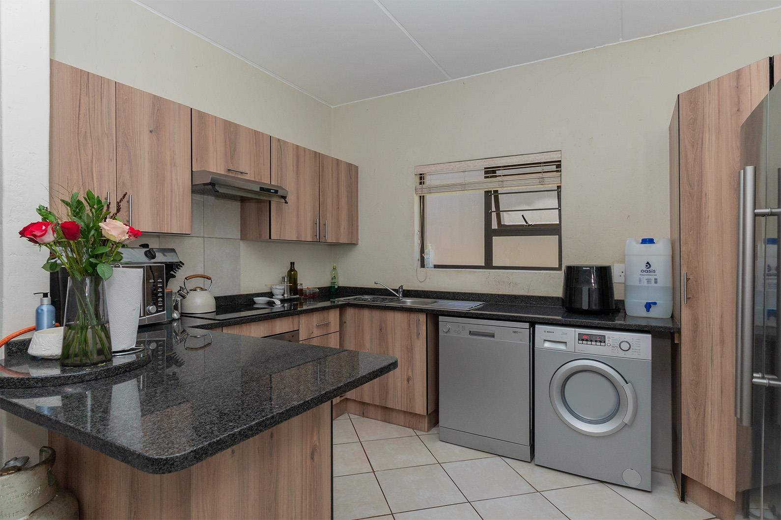 Open plan tiled lounge, open plan kitchen with granite tops, breakfast counter, glass hob, under counter oven, extractor fan, ample cupboards, tiled entertainment area with built in braai and stacker doors opening up to quaint garden, storeroom under staircase, 2 good sized tiled bedrooms, 2 bathrooms with one being en-suite to main bedroom, 2 carports.