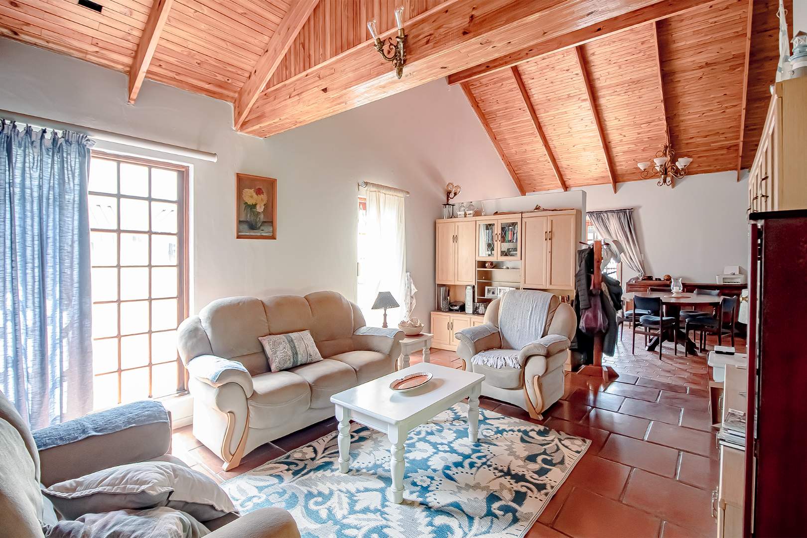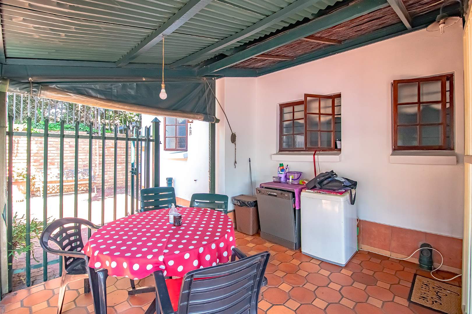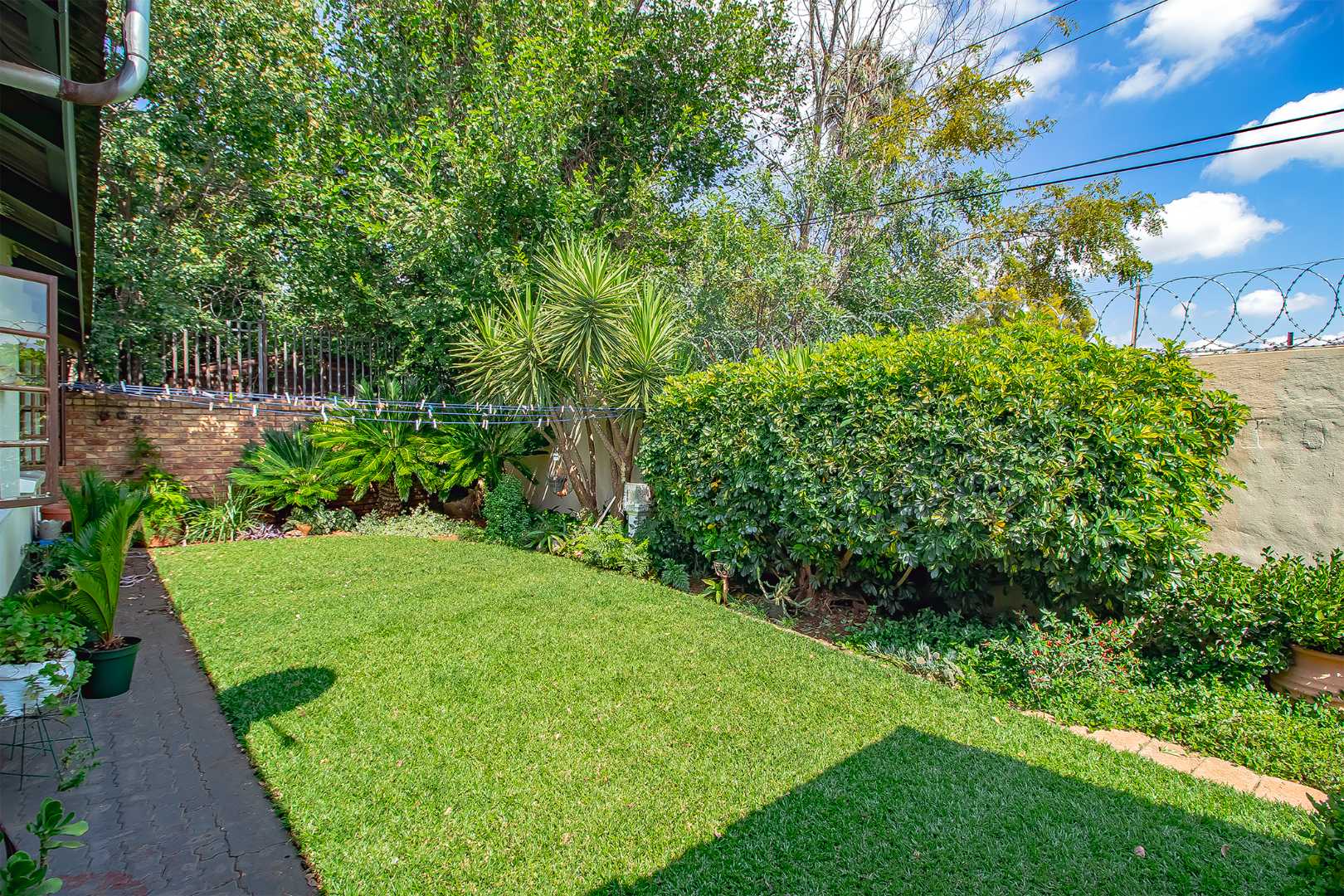 This flows to the dining room and lounge with double doors that lead out to the back garden with a built-in braai.