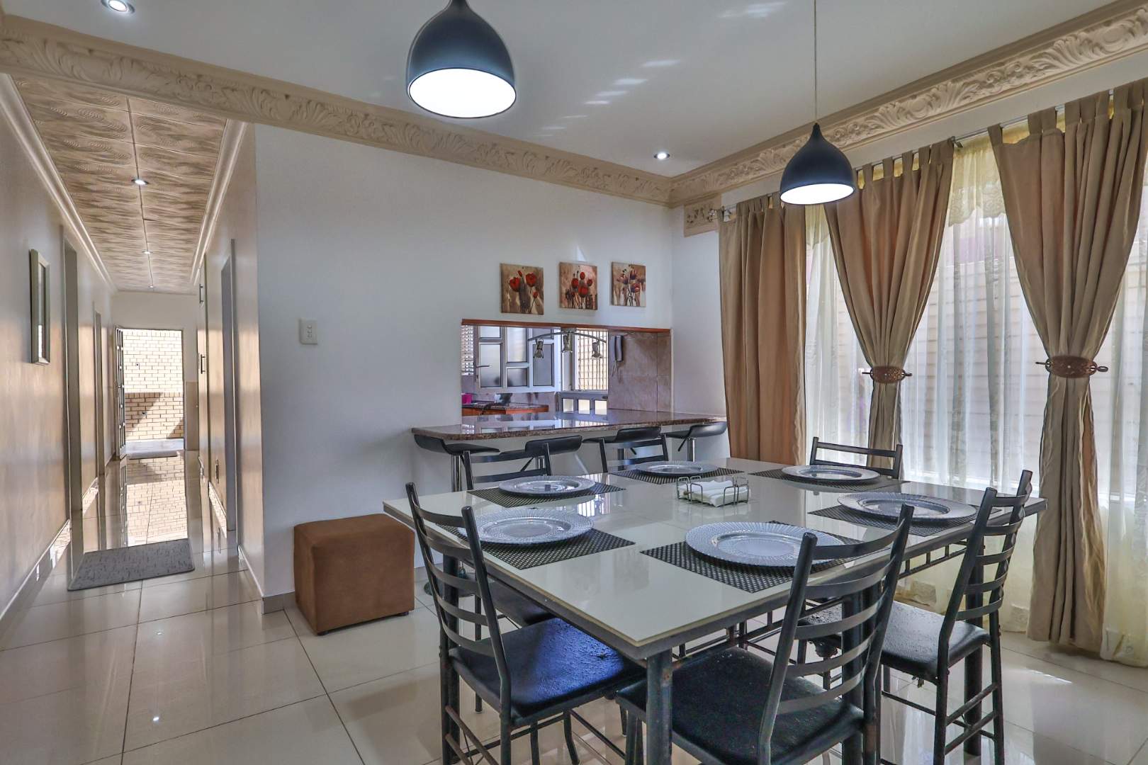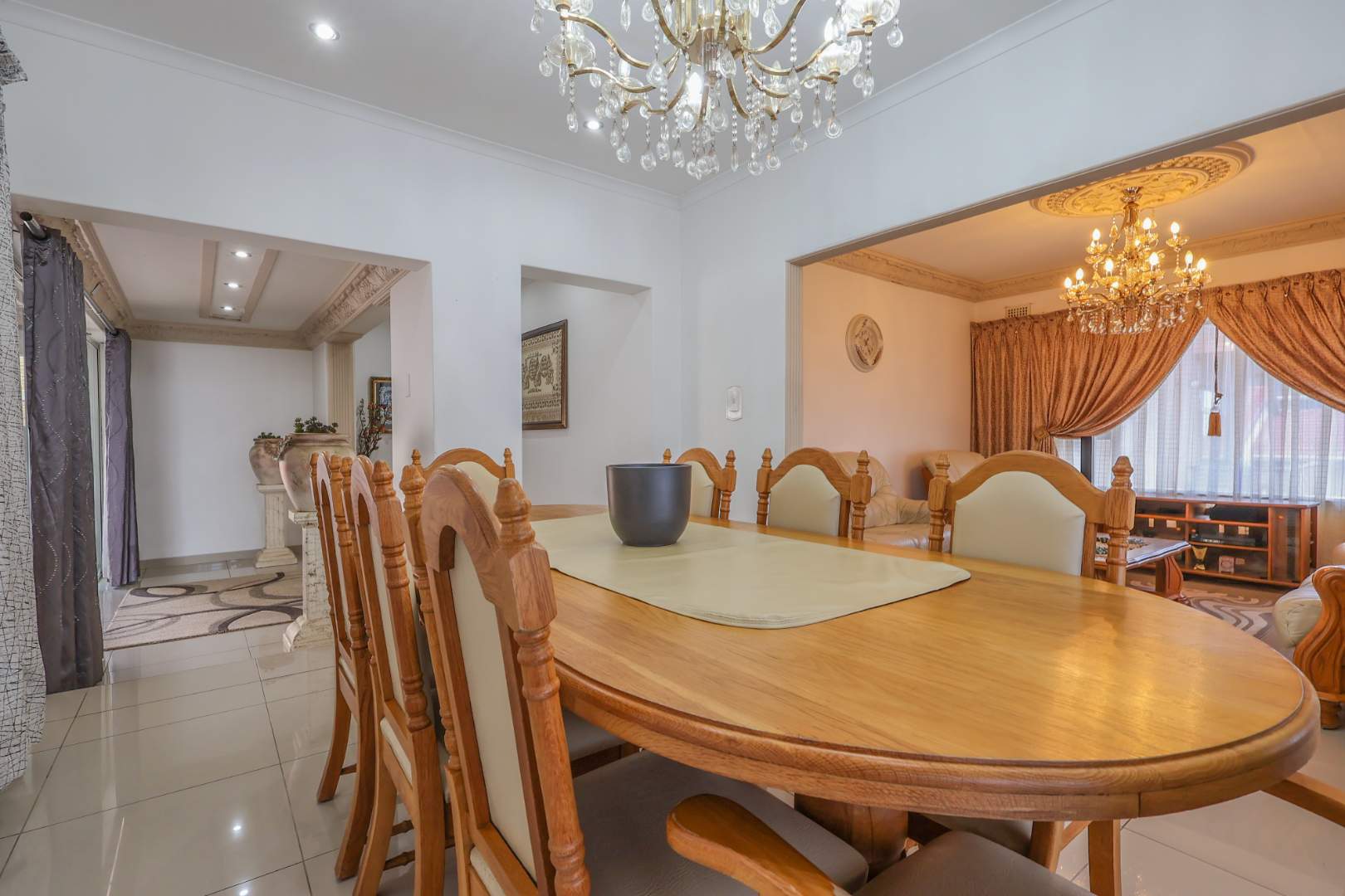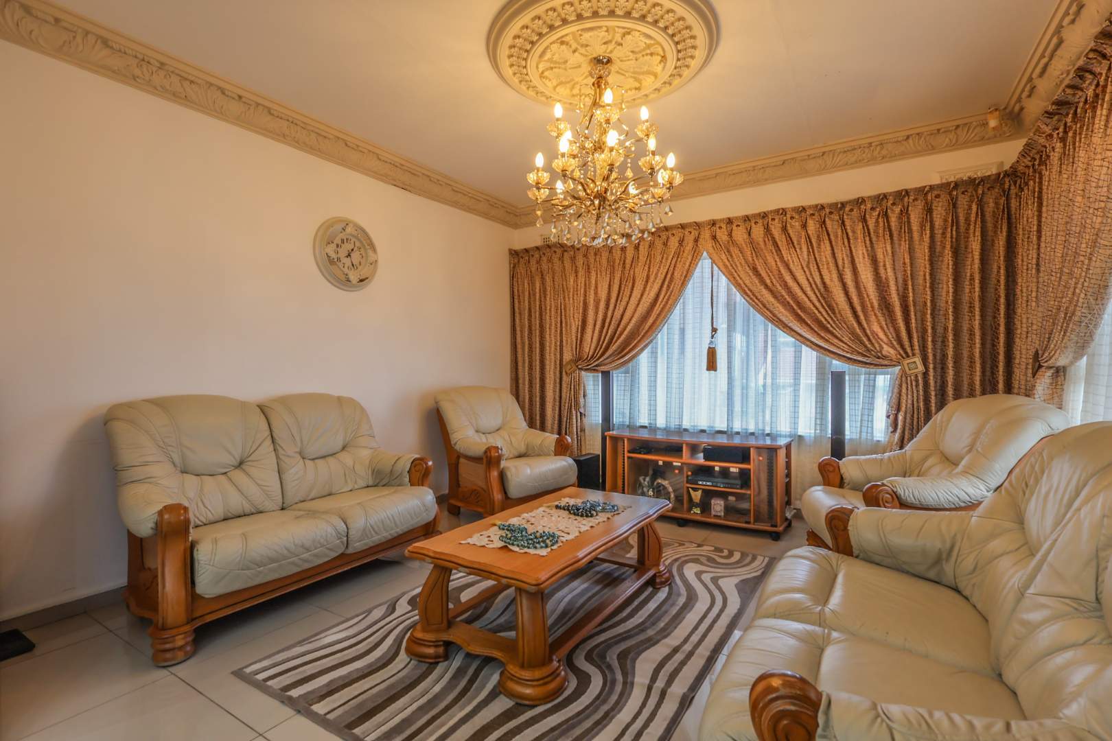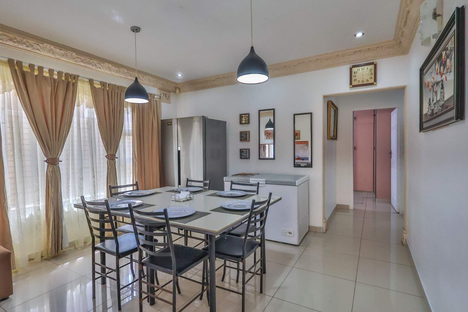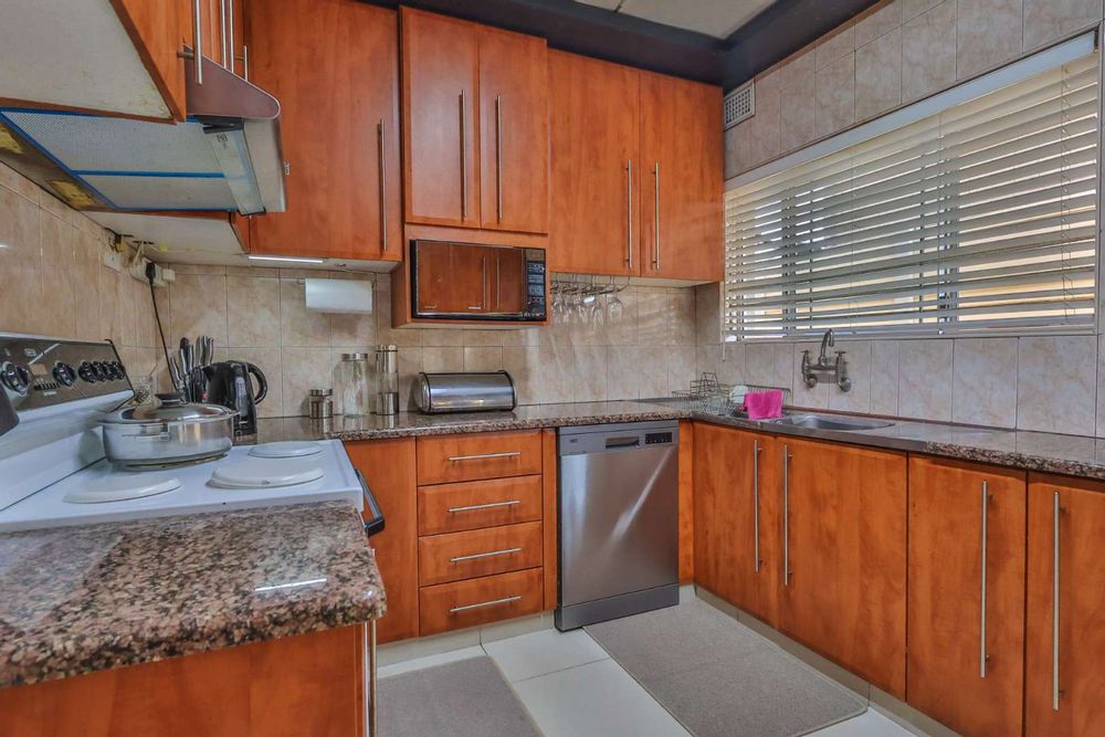Securely set behind a motorised gate with a double garage, the home offers 4 bedrooms, 2 bathrooms and porcelain tiles throughout. Open-plan lounge and dining areas flow effortlessly into a large kitchen with a cosy eating space — practical, warm, and well thought out.