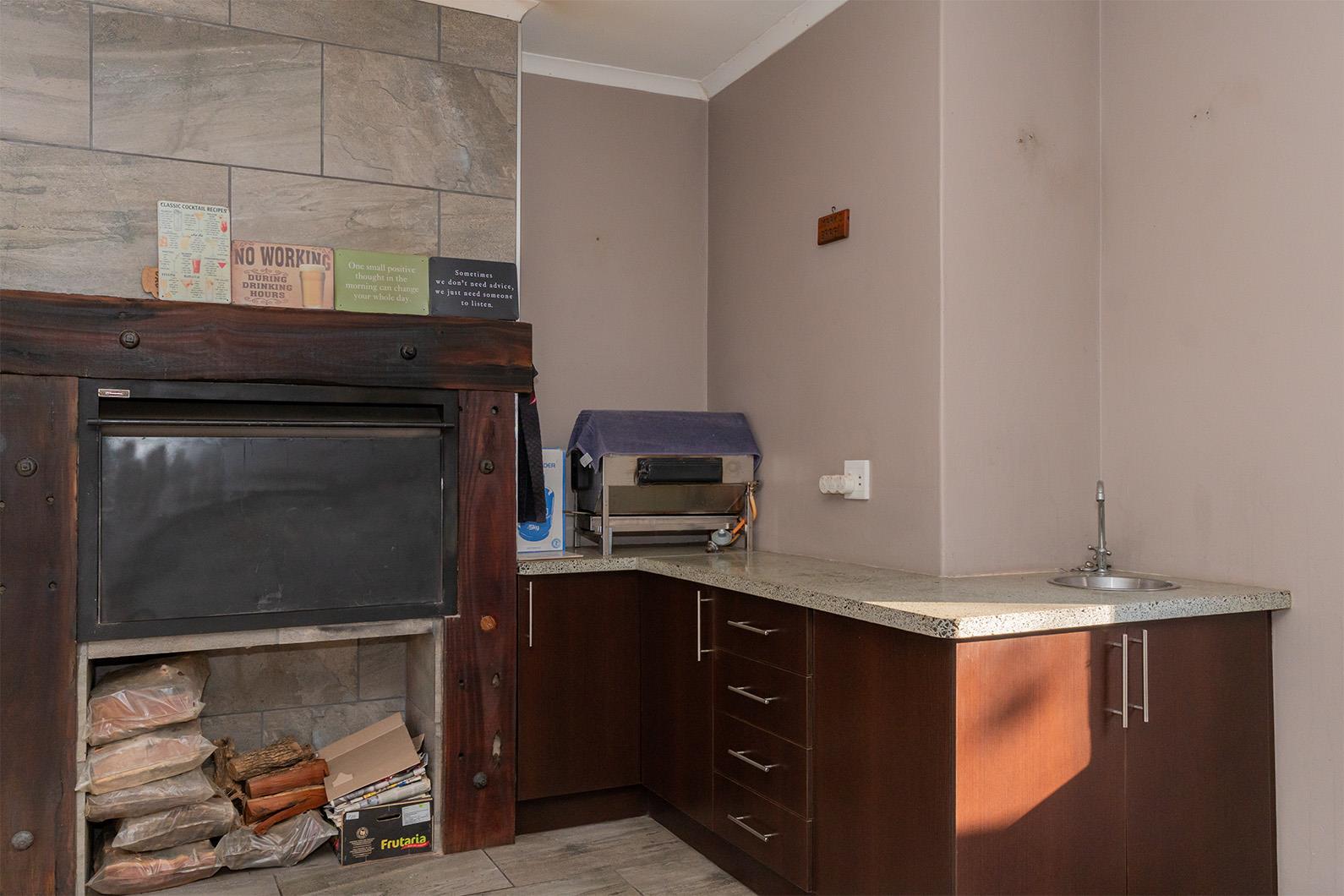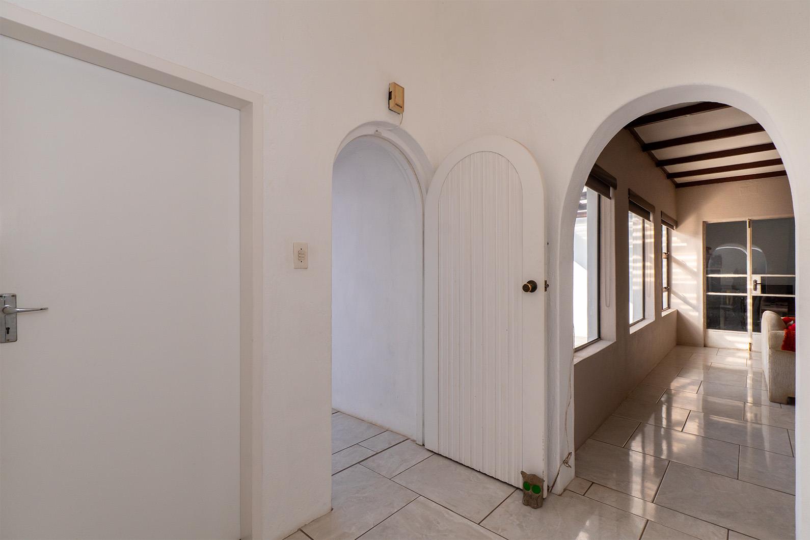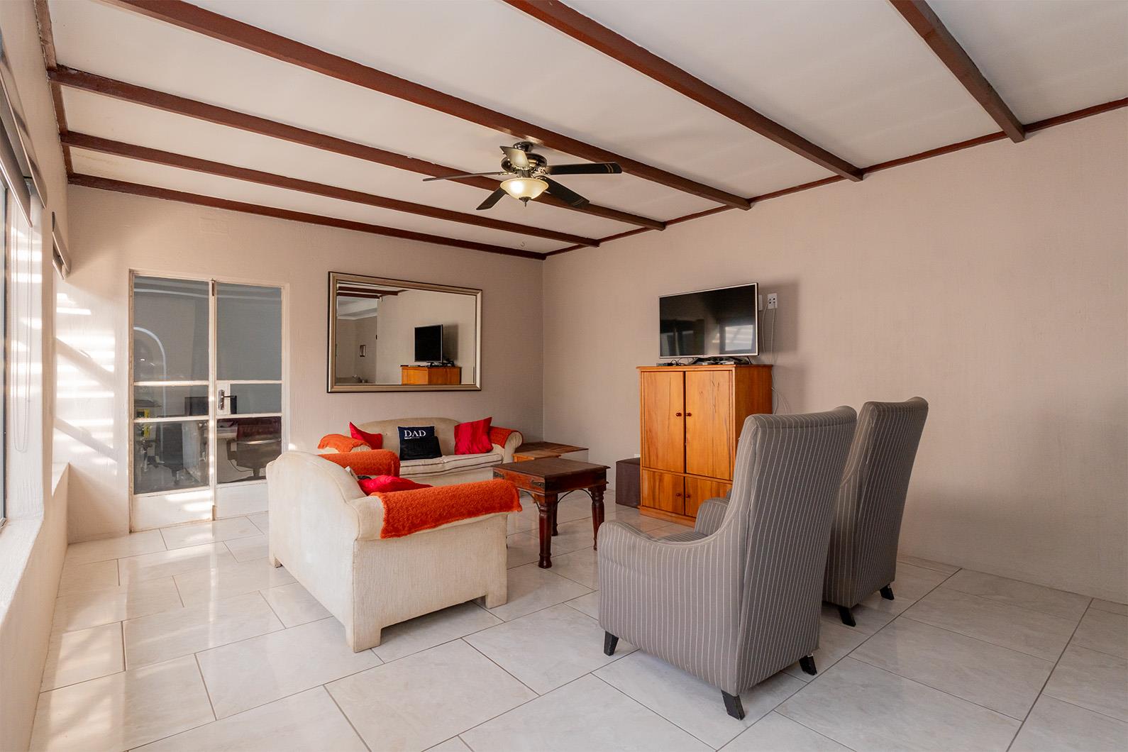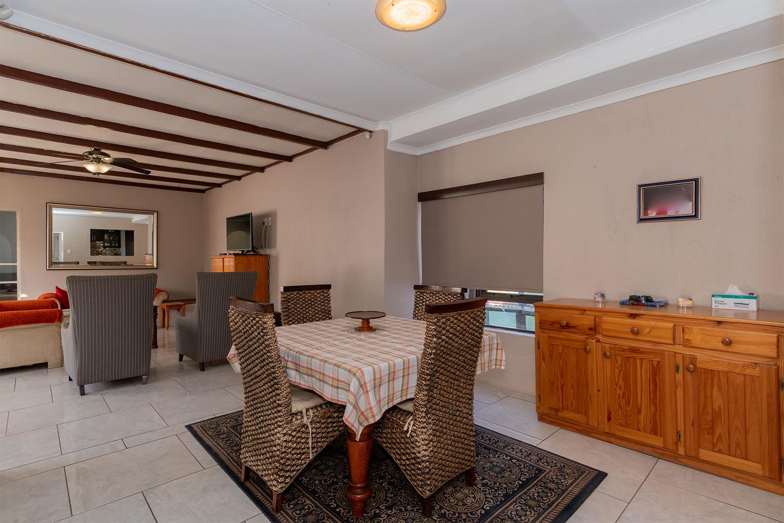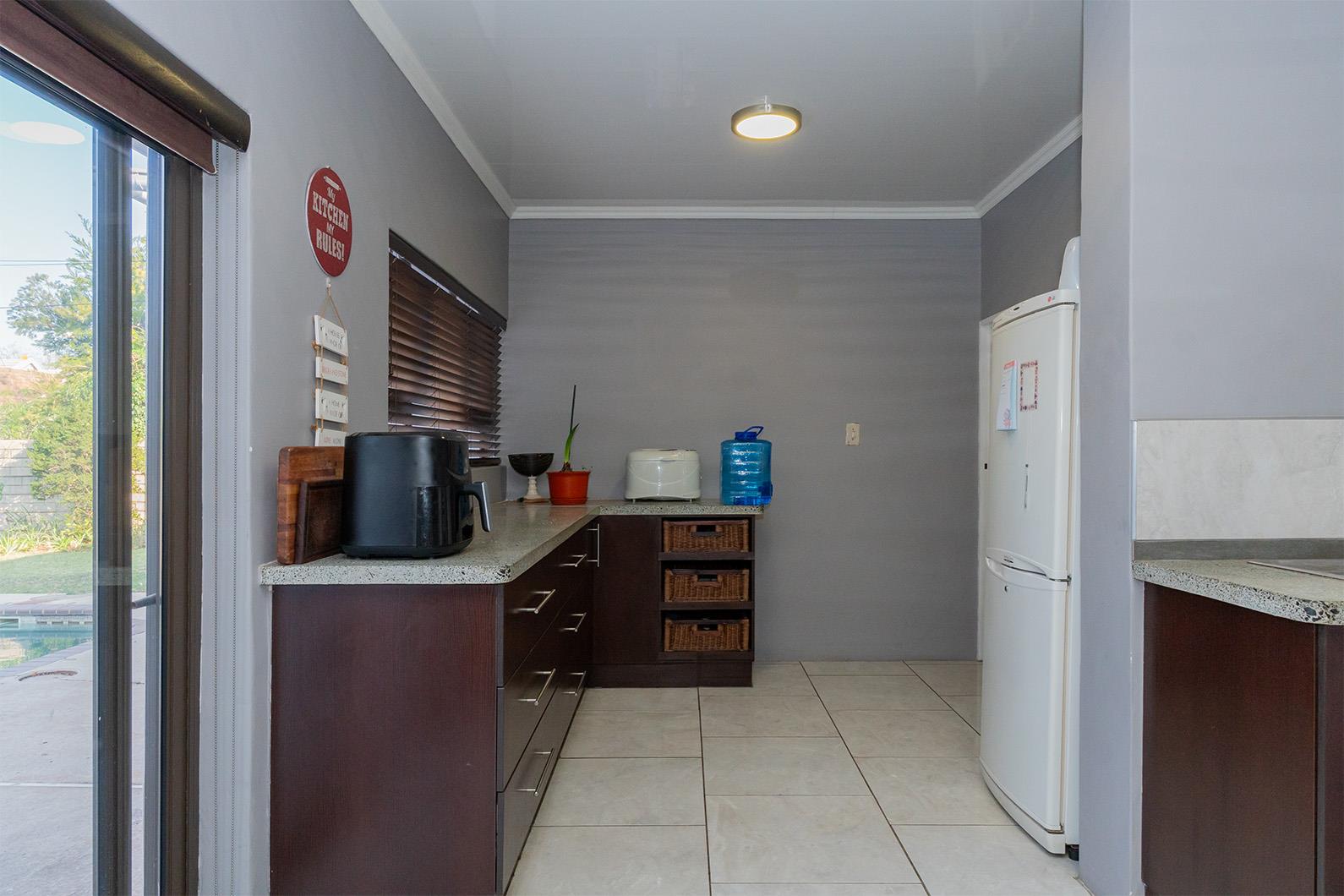 Tiled entrance hall, combined spacious tiled lounge and dining room with french doors leading to separate office area - 24sqm, exquisite kitchen with ample cupboards, gas hob, eye level oven, concrete tops, combined scullery, sliders to garden and pool, outside laundry area off kitchen with single trough, 4 good sized bedrooms with built in cupboards of which 2 is tiled and the other 2 is carpeted, spacious tiled main bedroom with walk in dresser and en-suite bathroom with bath, toilet, basin and vanity, second renovated bathroom in passage with bath, toilet, shower, basin and vanity, linen cupboard in passage, large tiled entertainment room off kitchen with built in braai, work station, guest toilet and sliders to patio overlooking the pool, double garage with direct entry into study/office area, large 24sqm storeroom/workshop off garage with door to garden, double IBR carport that can accommodate a caravan/high vehicle.
