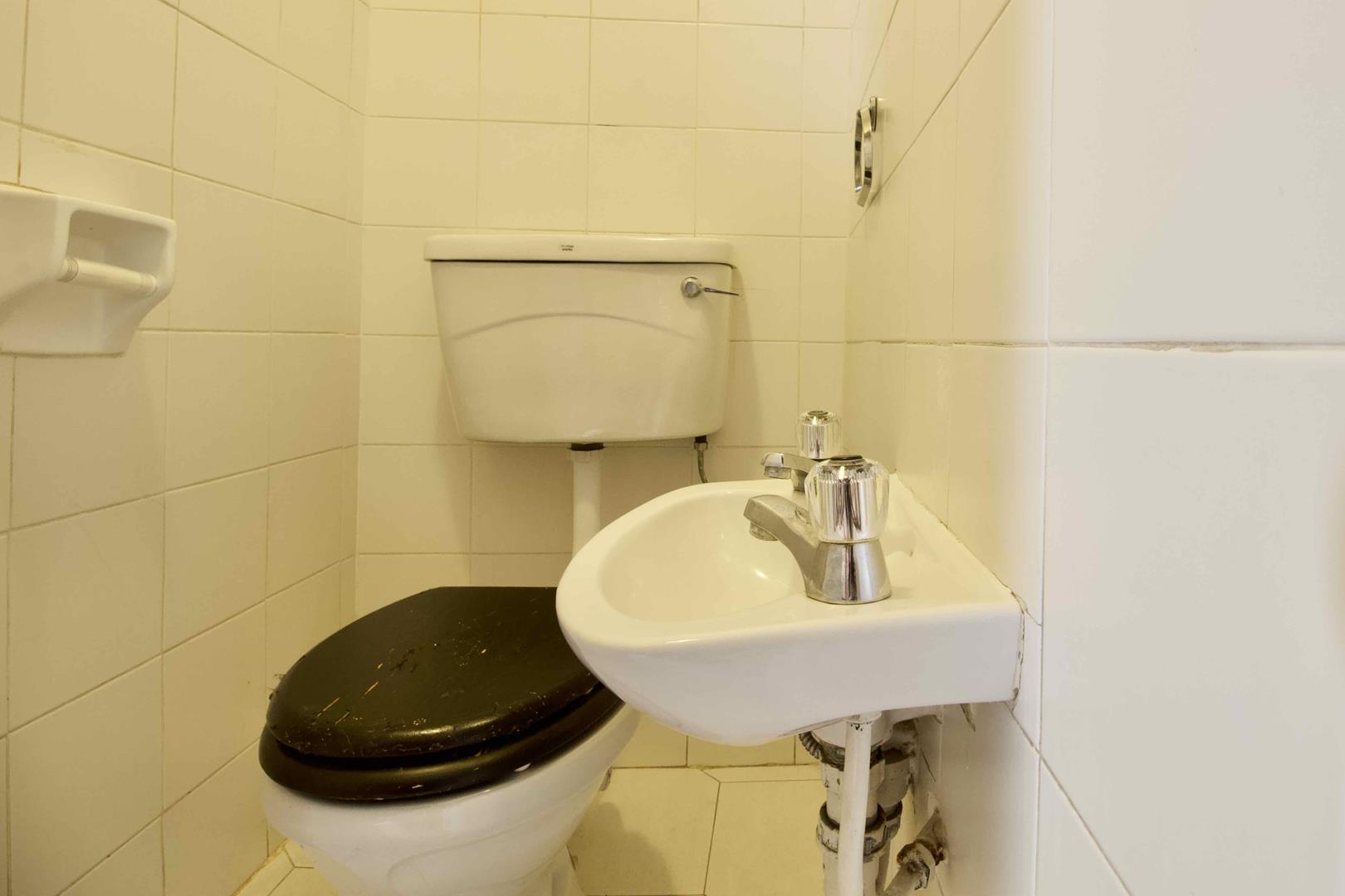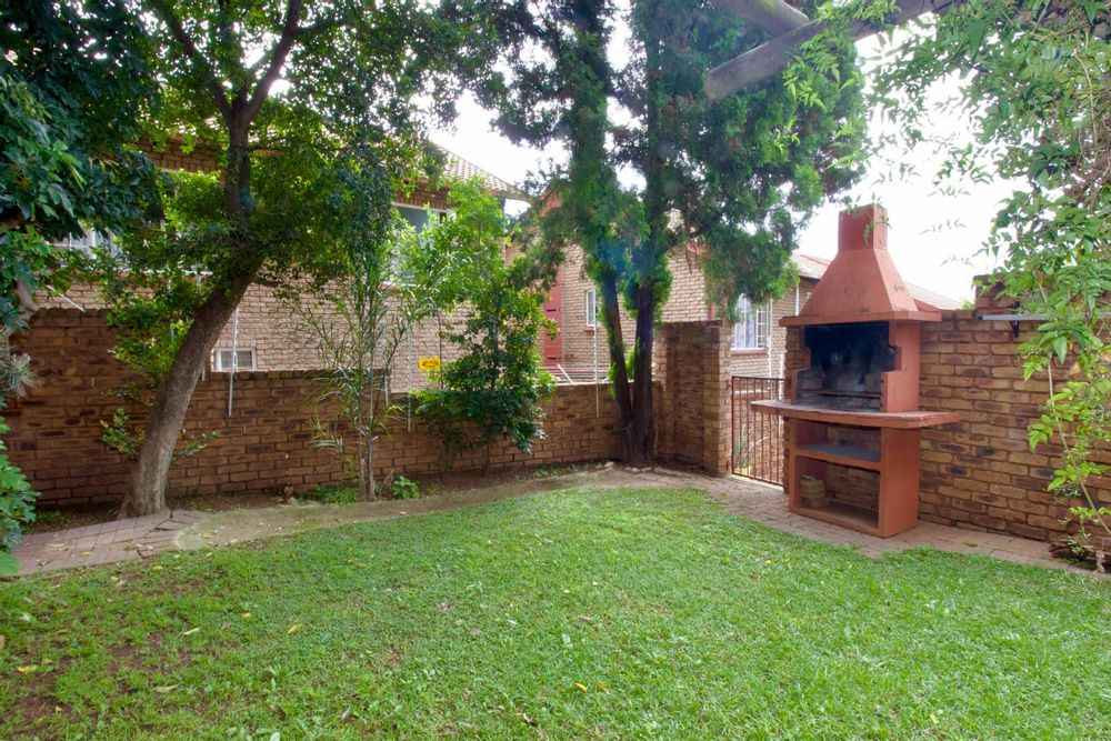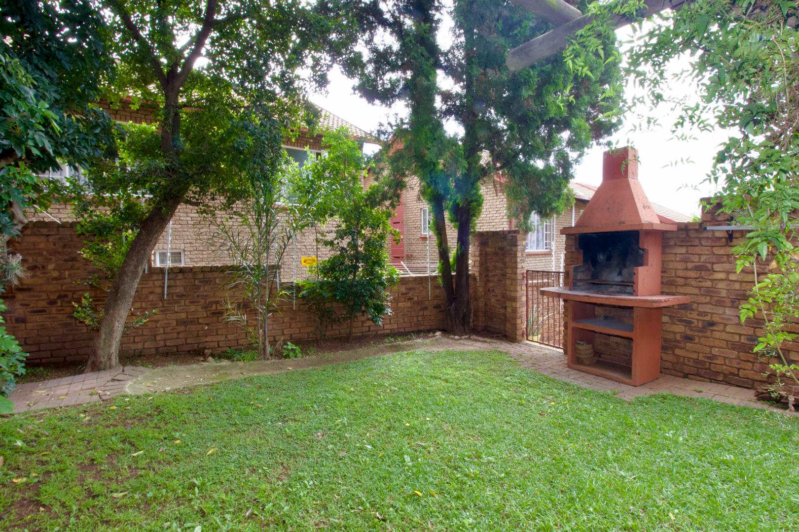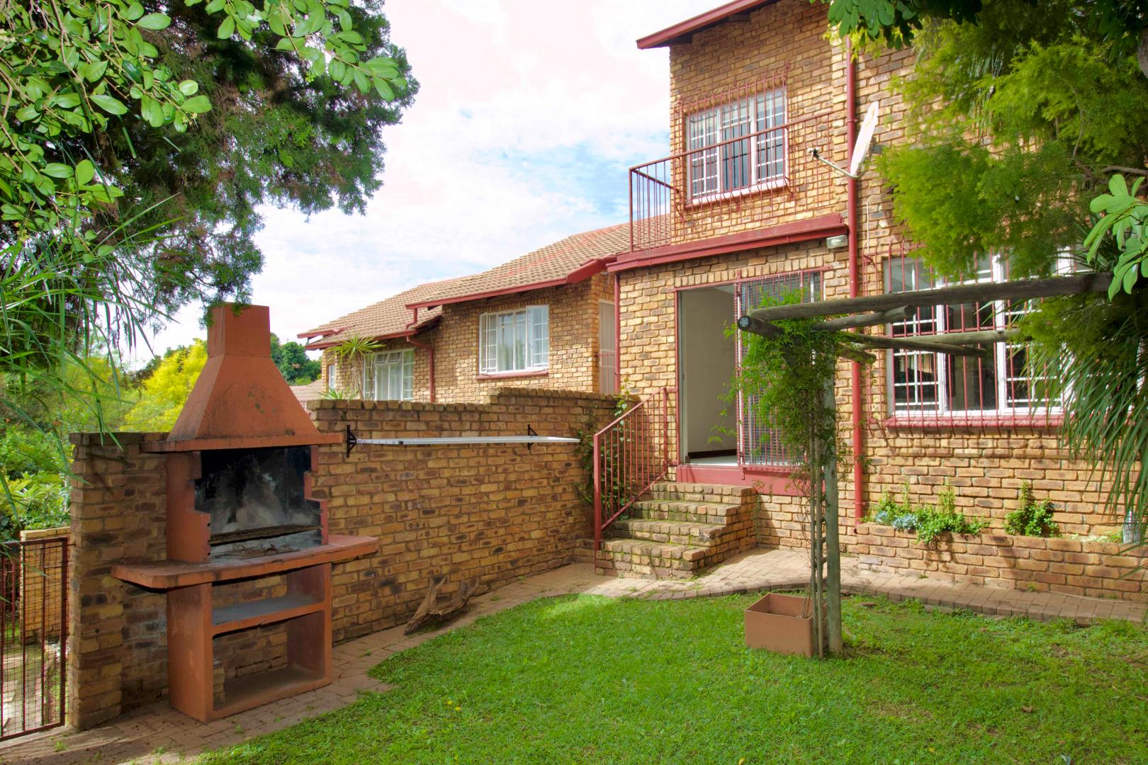 The ground floor comprises a guest toilet with a compact basin, in addition to an open-plan living area that integrates the dining, lounge, and kitchen spaces. A sliding door from the lounge opens to a well-kept garden, complete with a built-in braai, providing a perfect space for outdoor entertainment.