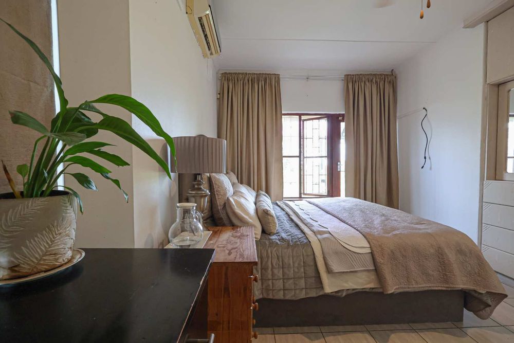 Main Bedroom – Aircon, ceiling fan, built-in cupboards, garden access + en-suite bathroom