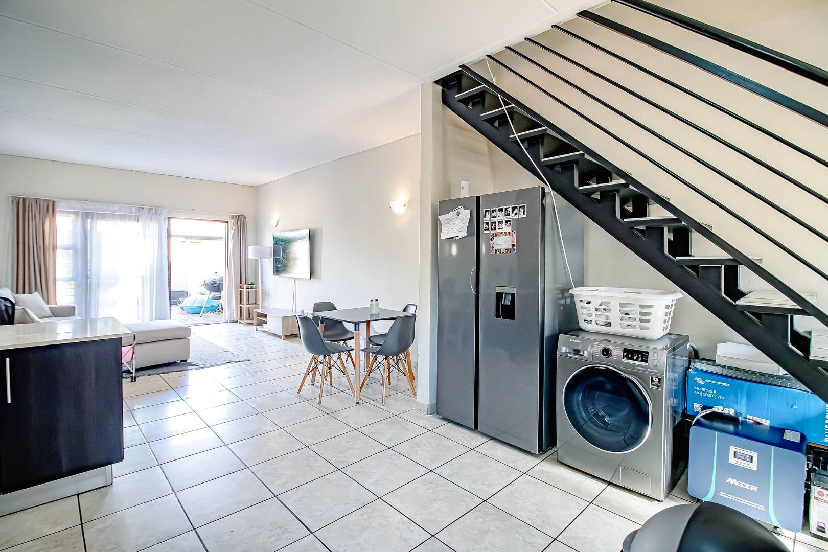 This lovely south-facing duplex is situated in a quiet, secure estate. Upstairs you’ll find 2 bedrooms and 2 bathrooms, while the downstairs offers an open-plan lounge and dining area leading into a large kitchen with ample cupboard space and room for a dishwasher, double fridge, and washing machine.