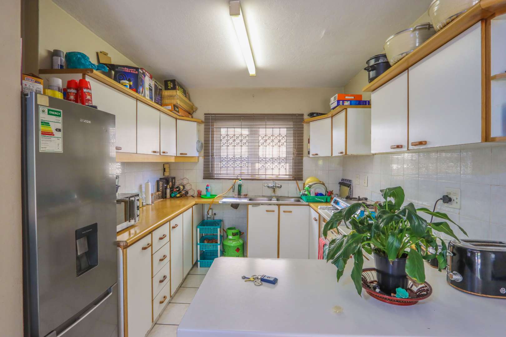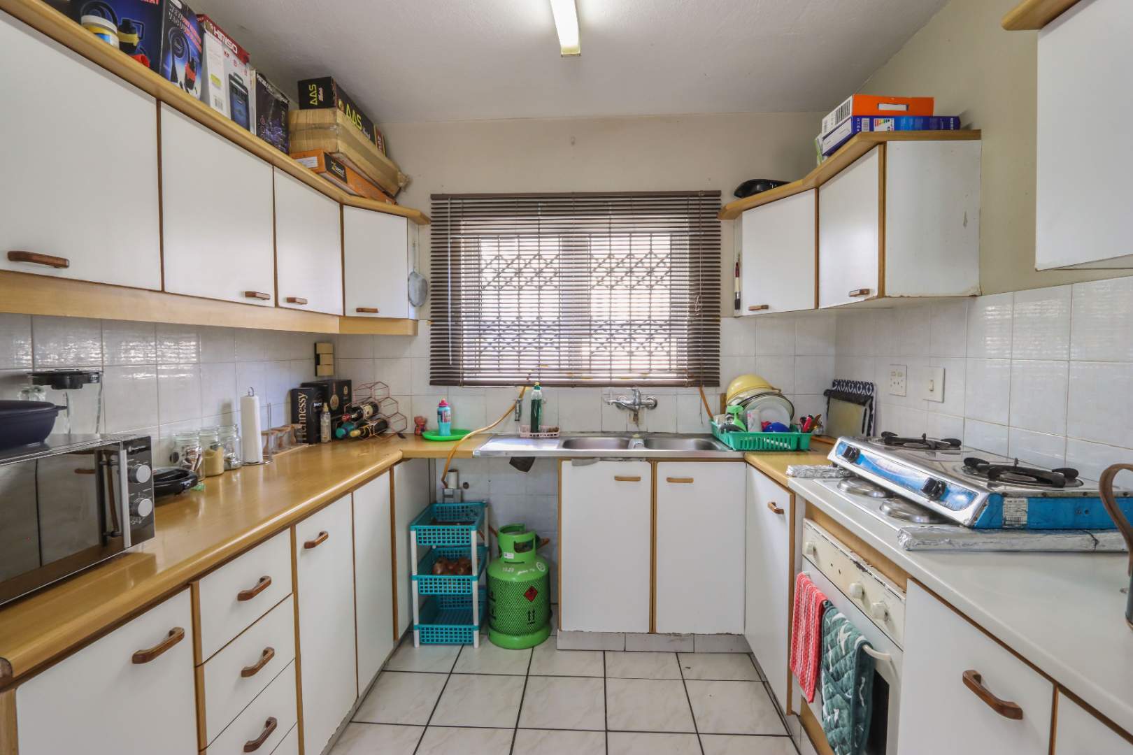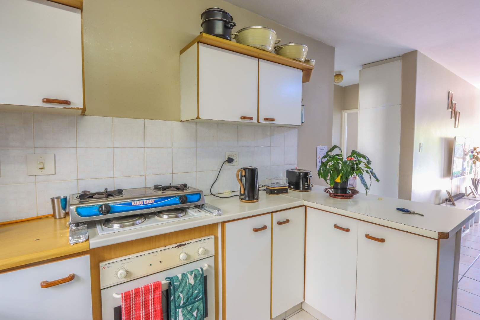Modern kitchen, fully tiled with built-in cupboards