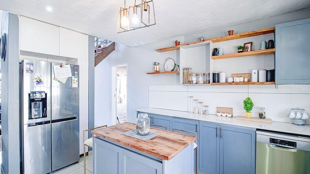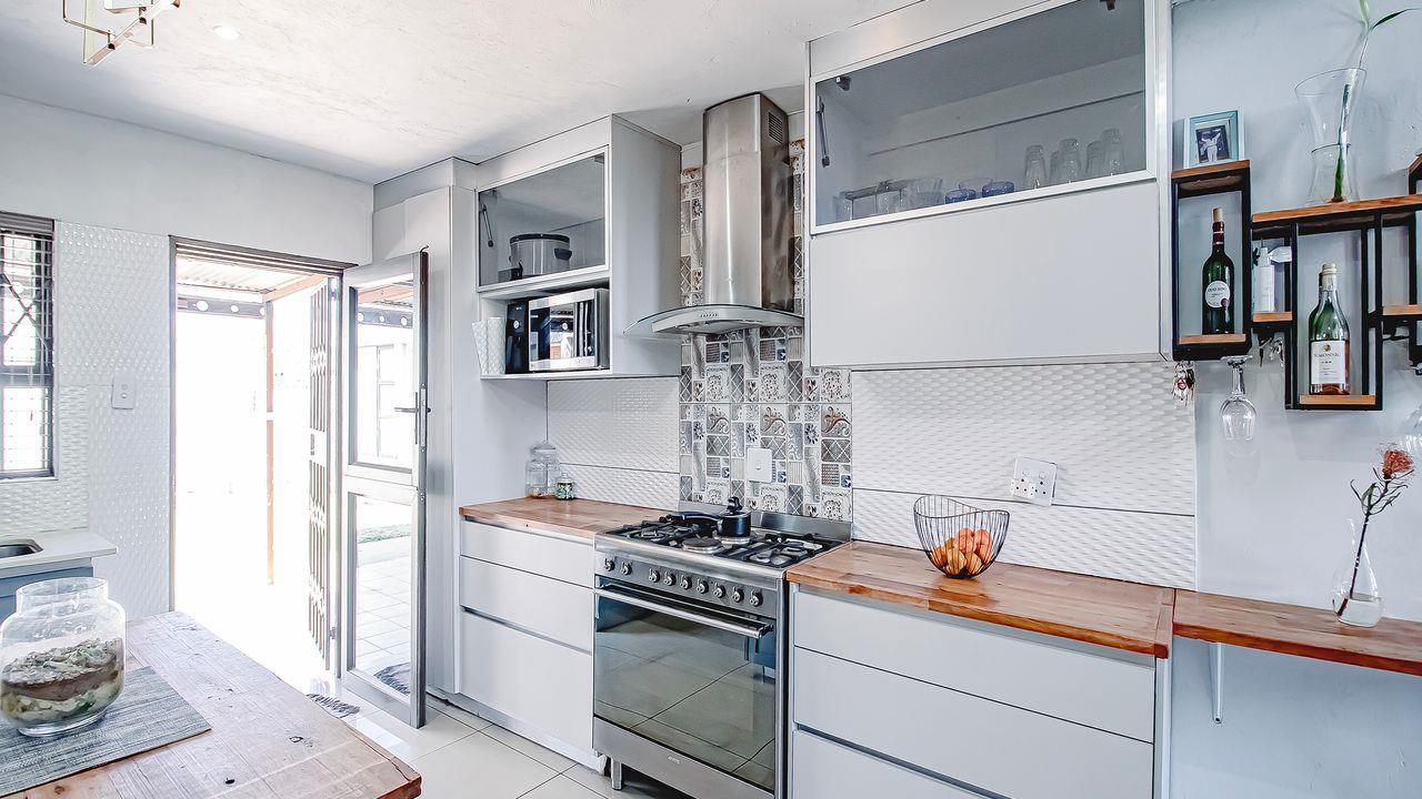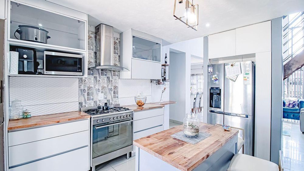 -A modern and practical kitchen with plenty of cupboards and a gas stove