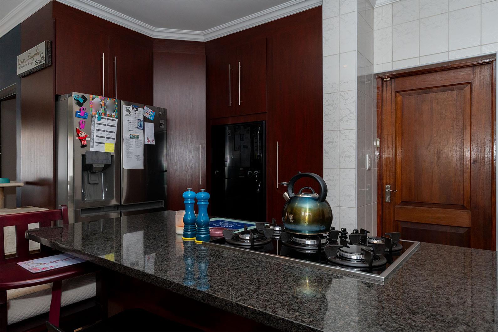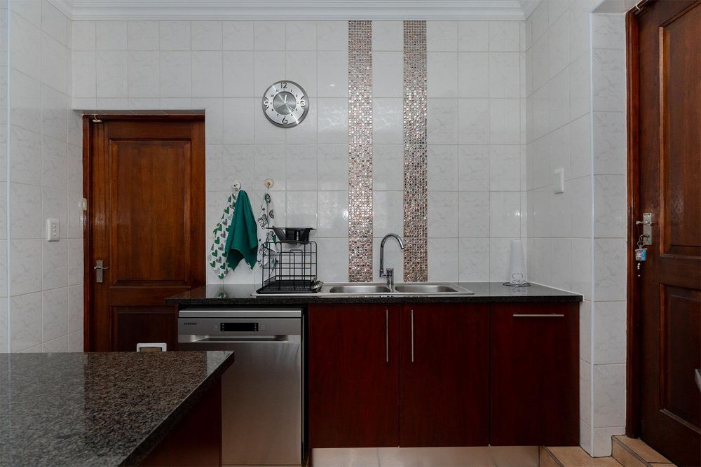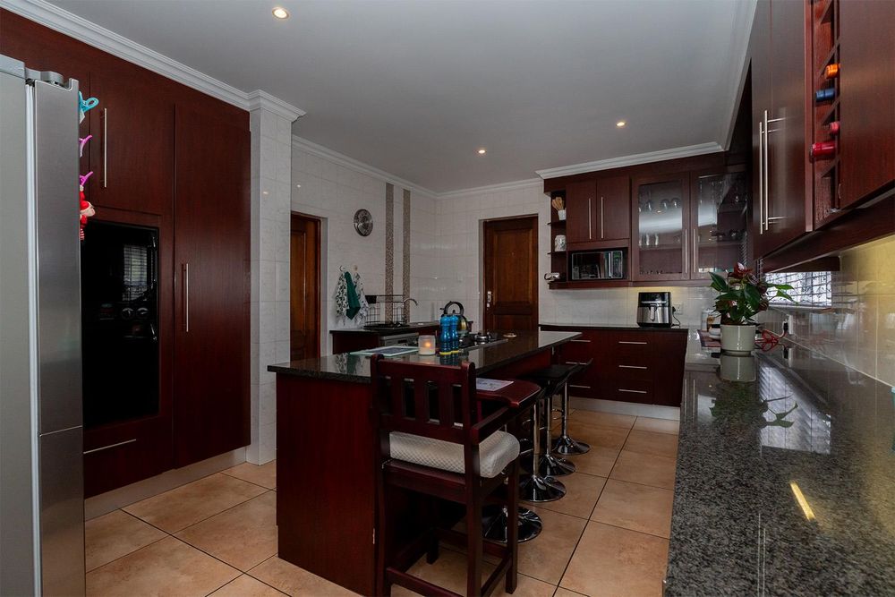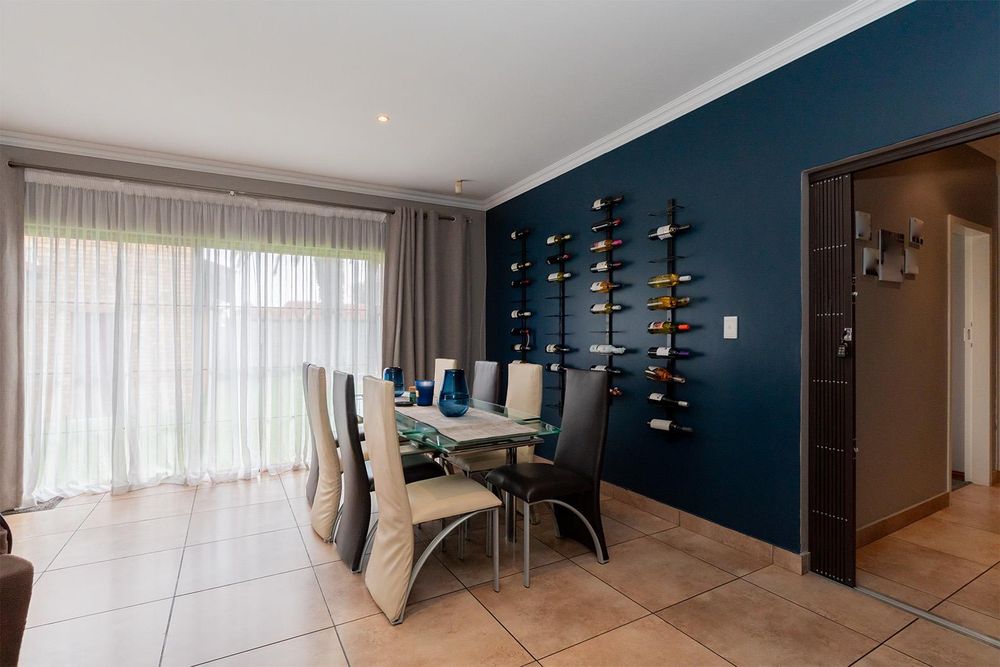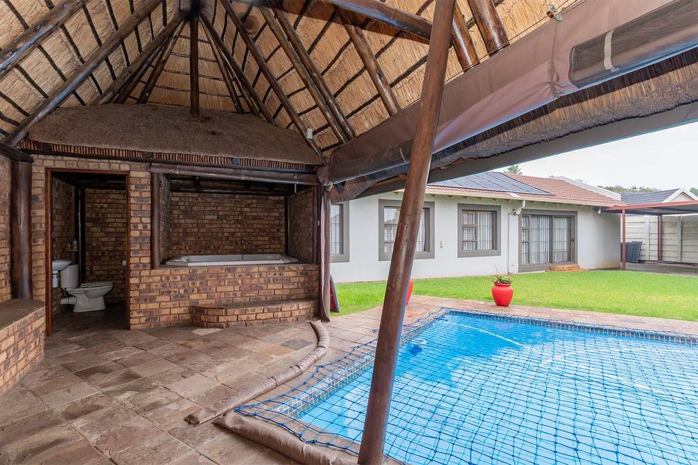 Quaint tiled entrance hall, spacious tiled lounge with combined dining area and sliders leading to immaculate garden, gourmet open plan kitchen with granite tops, breakfast counter, double eye level oven, island with gas hob, ample cupboards and drawers with soft close feature, space for double fridge with water connection, combined scullery with space for a dishwasher and covered courtyard off kitchen, 3 good sized carpeted bedrooms with main bedroom having a large walk in closet, large tiled guest suite off the double garage with loads of cupboards and sliders to carport, 3 modern bathrooms with one being en-suite to main bedroom and another en-suite to guest bedroom, linen cupboard in passage, large double automated garage with direct entry and plumbing for washing machine, another 100sqm tiled automated garage with small office - possible flatlet conversion, carports for approximately 5 cars, exquisite entertainment area with canvas awnings - approximately 95sqm with built in braai, bar, bathroom with toilet and basin, jacuzzi - gas operated, large solar heated pool, staff quarters - tiled bedroom with bathroom.